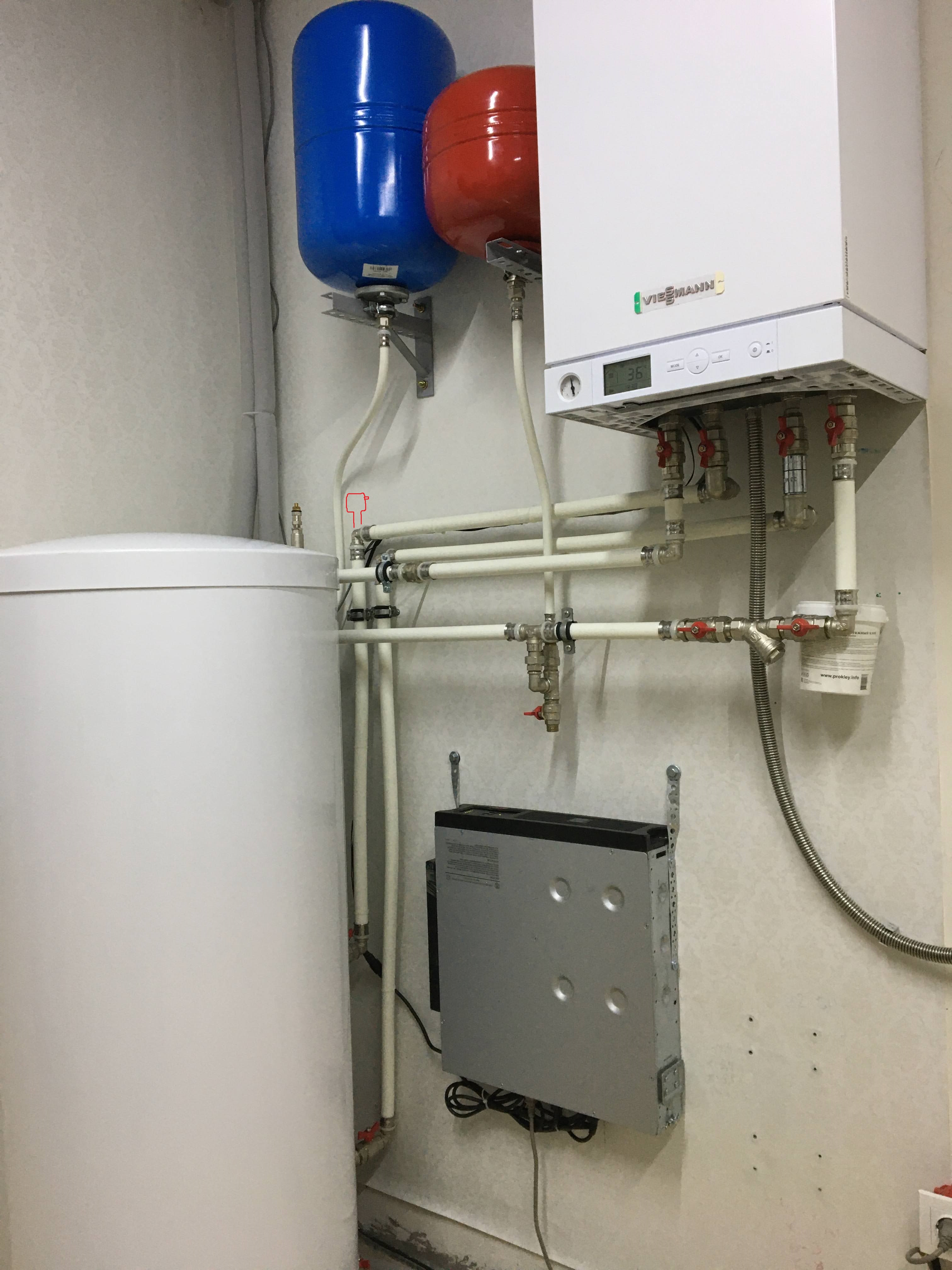 Добрый день. Подскажите как удалить воздух. Система отопления 1к котел Висман +БКН. Когда работает на отопление воздуха не слышно, все что осталось в системе, ушло в батареи и выведено через маевского. А при работе на бойлер постоянно булькает, (такой звук "буууль" идет в сторону насоса, этот воздух разбивается на мельчайшие пузырьки, собирается где-то там в районе бойлера, и опять по кругу). Этот воздух почему-то не уходит в сторону батарей. Работает так уже пару лет как. Воздухоотводчик, который в котле начал течь, и закрыт почти всегда, если его открыть, то выйдет малюсенький пузырек воздуха, а дальше вода потечет неспеша. Был установлен дополнительный воздухоотводчик, нарисован красным на фото. Толку от него 0, возможно потому что установлен на подаче в бойлер, и мелкие пузырьки не успевают скопиться в нем, чтоб выйти. Пожалуйста, подскажите, куда установить воздухоотводчик, на какую точку этого участка отопления (подача-обратка на бойлер), чтоб он наконец вышел. И посоветуйте фирму. Спасибо!!