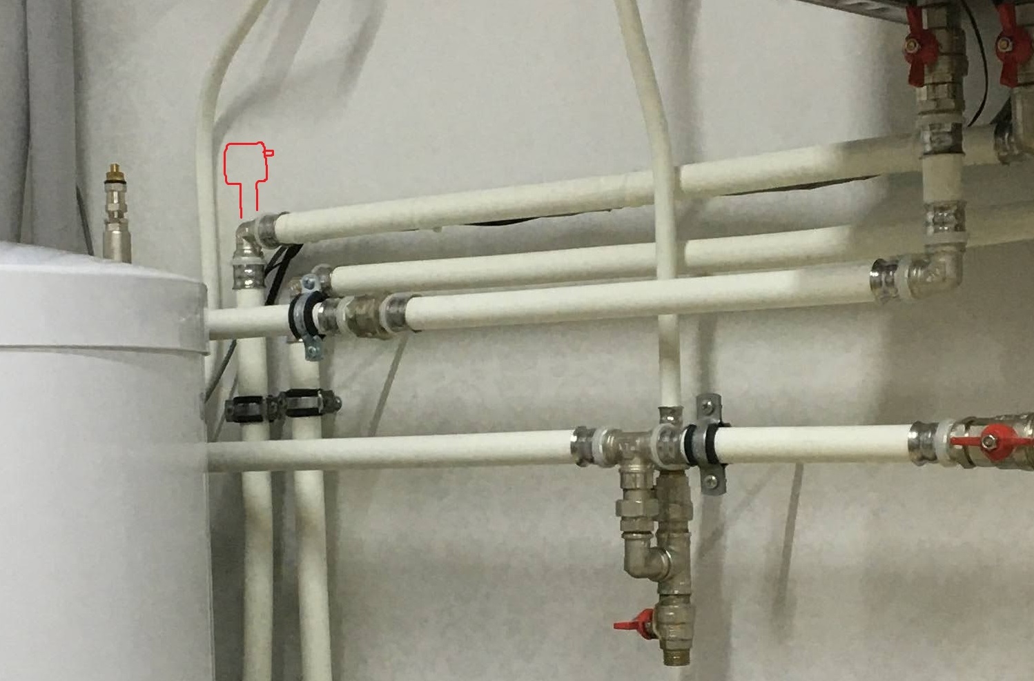Не понятно, как открыть фото в полном размере, Воздухоотвоодчик установлен там где переход с горизонтальной части трубы на вертикальную на подаче, прям радом с бойлером.
