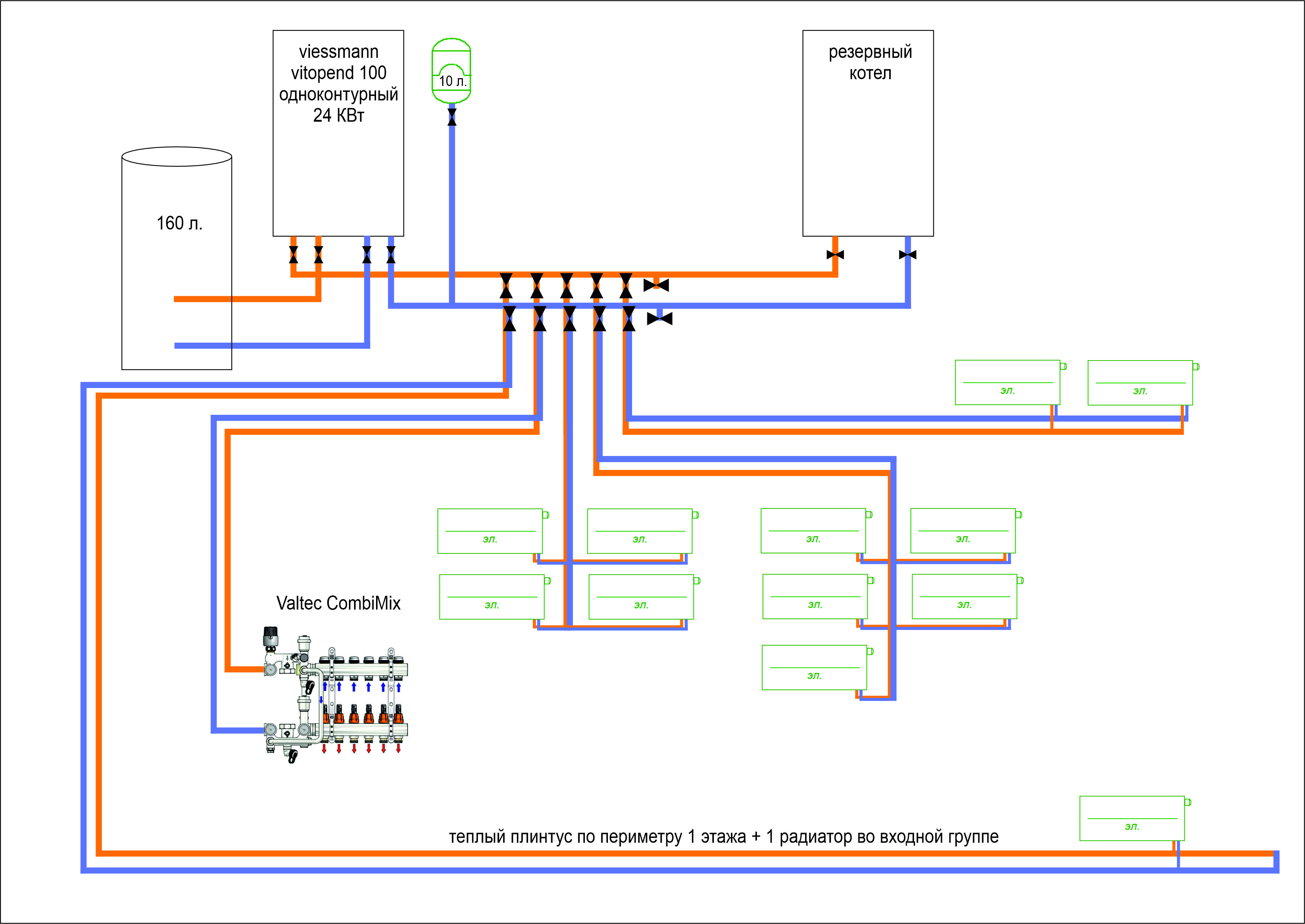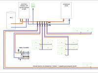 Имею дом с такой схемой отопления. 1 этаж: теплые полы + теплый плинтус по периметру (во входной группе подключен 1 радиатор). 2 этаж: полностью на радиаторах отопления Теплоноситель – пропиленгликоль Дом – 220 м. кв., 1 этаж примерно 110 м. кв., контур полностью закрыт, дом нежилой, межкомнатных дверей нет, мебели нет, теплый пол первого этажа имеет чистовое покрытие (керамогранит), радиаторы – стальные панельные, газификация осуществлена. Температура воздуха на улице «-5 градусов» 1. В настройках выбирал работу котла по термостату в 23 градуса (термостат стоял на 1 этаже в зале), но на втором этаже гораздо прохладнее чем на 1 этаже, первый этаж – 23 градуса, 2 этаж – 19,5. 2. Перенес термостат на второй этаж, как результат, котел работает в более интенсивном режиме, температура теплоносителя достигает 75 градусов, но температура на втором этаже около 21 градуса, при выставленной в 25 градусов. Давление теплоносителя вырастало с 2х атмосфер, до 3х атмосфер, котел начинал стравливать выросшее давление через клапан, в котельной появился запах и сладковатый привкус теплоносителя. Отключал отопление полностью, дом стоял неделю без отопления, уличная температура была от -7 до +4. Перед запуском отопления температура помещений была +12 градусов, выставил на термостате +22 и запустил котел, спустя 2е суток, котел прогрел дом только до +19 градусов. 3. Подключал котел с настройкой кривой отопления с наружным датчиком температуры, результат такой же - не смог прогреть второй этаж до желаемой температуры, но котел не тактовал при этом, давление не повышалось до 3х атмосфер. С такой ситуацией, котел уже проработал 2 зимних сезона, специалист который осуществлял монтаж, сказал что с системой все ок, а за тем и вовсе пропал и не выходит на связь. Помогите, подскажите, что в данной схеме неправильно или как лучше организовать/переделать данную систему отопления? Планирую закончить ремонт и вводить дом в эксплуатацию, но проживание в нем будет некомфортное с такой системой отопления. Заранее благодарю вас за помощь.